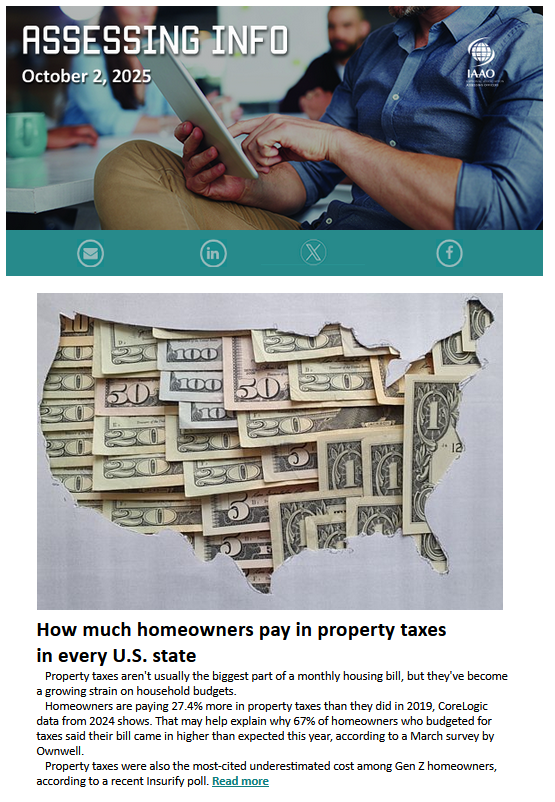 Assessing Info is a semi-monthly electronic newsletter designed to provide news and information for IAAO members and the assessment world-at-large. Published on the first and third Thursday of the month, Assessing Info provides assessors, and anyone interested in property tax policy and assessment administration, with all the latest news and events.